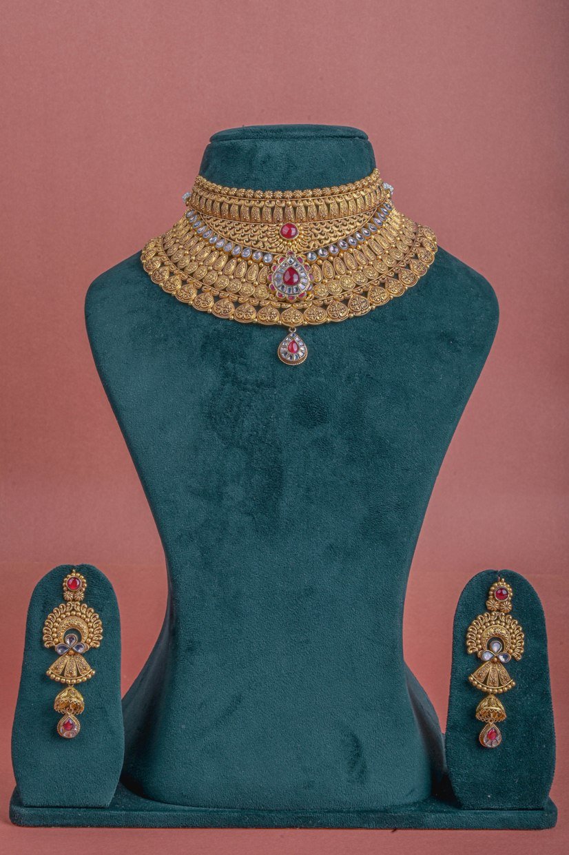 Embrace the opulence of your bridal day with this captivating necklace set. Despite its weighty presence, the design flows beautifully, creating a mesmerizing effect