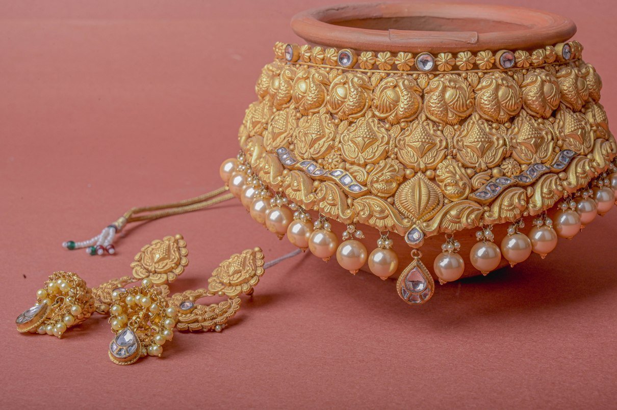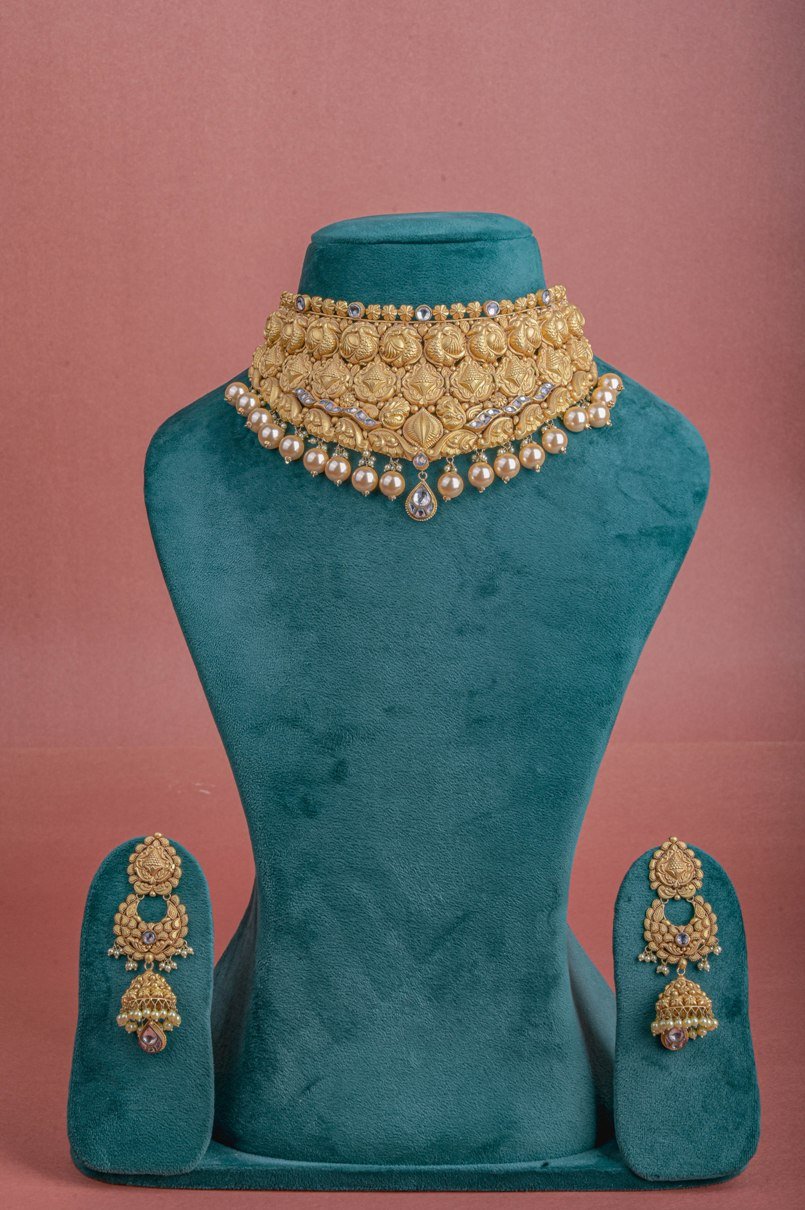 A Bridal Choker Necklace Set with Cascading Pearls. The weighty bridal choker, adorned with temple flourishes, features playful pearls that dance at the bottom, creating a whimsical and enchanting aura.