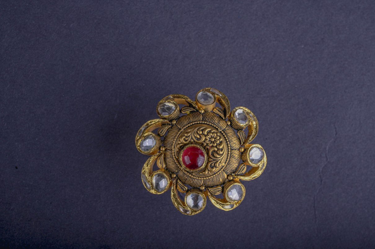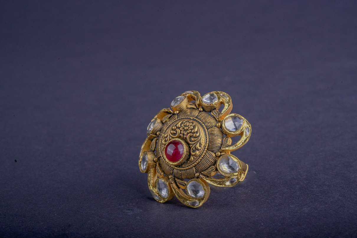 A captivating gold ring where red gemstone blazes at the centre of a swirling floral design.